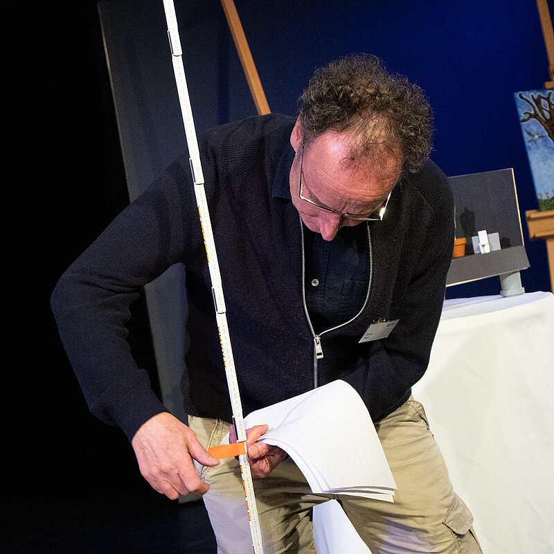Ein eindrucksvoller Moment war die Darstellung der prozentualen Kulturförderung für kulturelle Teilhabe im Vergleich Kultursenat Berlin zu Bayerische Staatsregierung: mittels Zollstock! Jeder Zentimeter stand für eine Million Euro und es wurde sichtbar, dass die Förderung inklusiver Theater in Bayern proportional nur die Höhe eines 10-Cent-Stücks auf dem Zollstock erreicht.